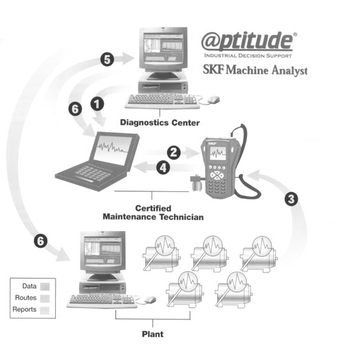 (6) Using the @ptitude system, an SKF analyst generates report or work order requests which are sent to the customer along with the supportive data. This information is also posted to a web server for future reference by the customer. The SKF Diagnostics Center provides the data repository. |